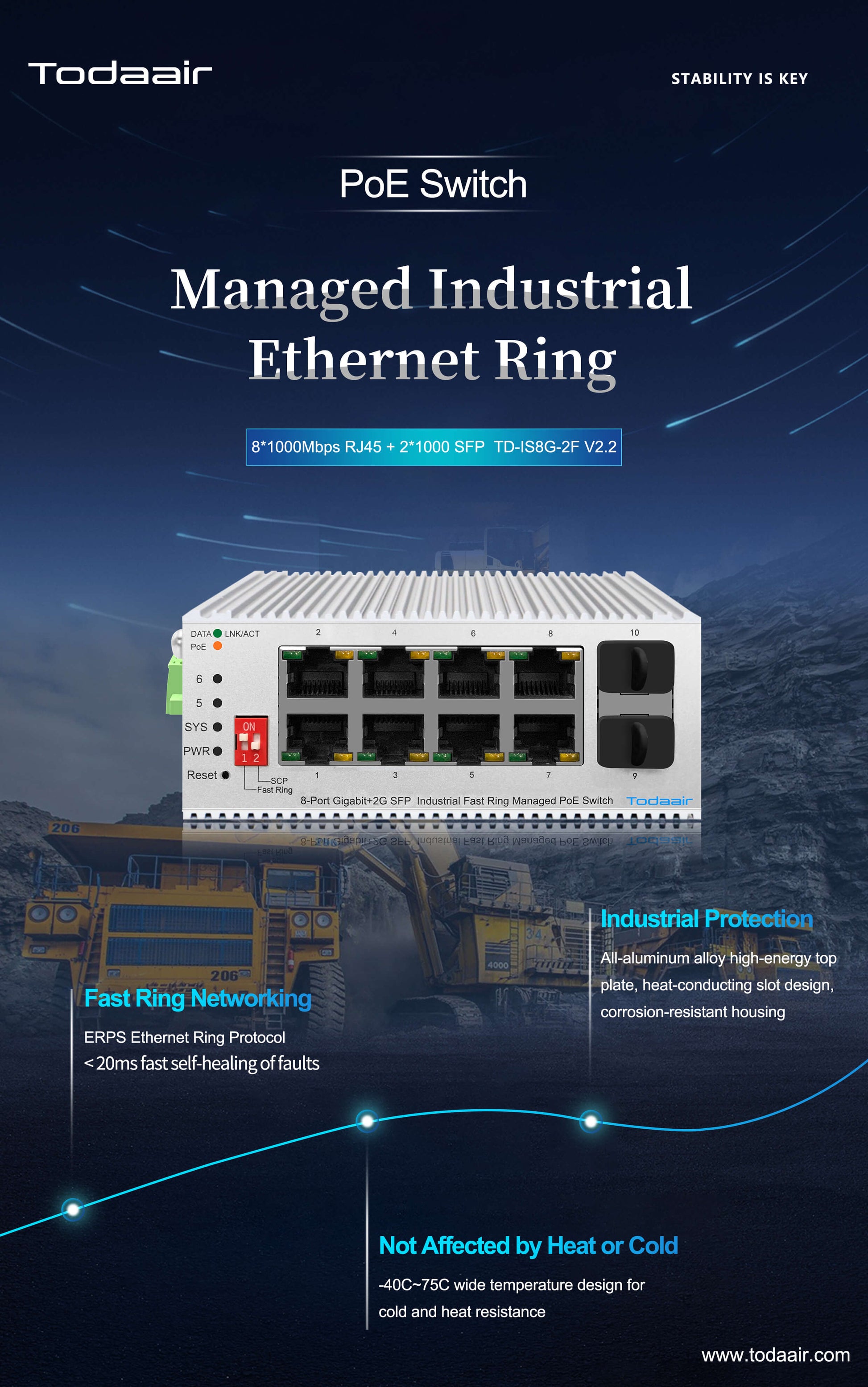 TD-IS8G-2F V2.2 Todaair POE Industrial Ring Network Switch