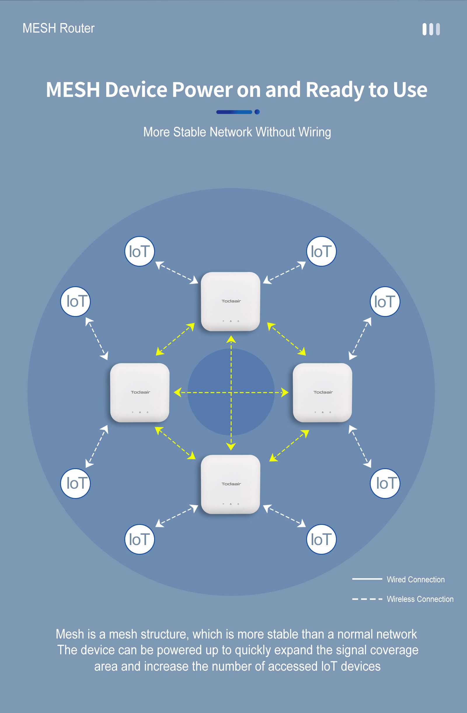 TD-MRT43 V30.1 adopts mesh connection technology, which can connect multiple MESH routers. It addresses the lack of routed wireless coverage of a single router by simply “one-click interconnect”, or adding two wired, one-click routers, making it easier for families to expand Wi-Fi.