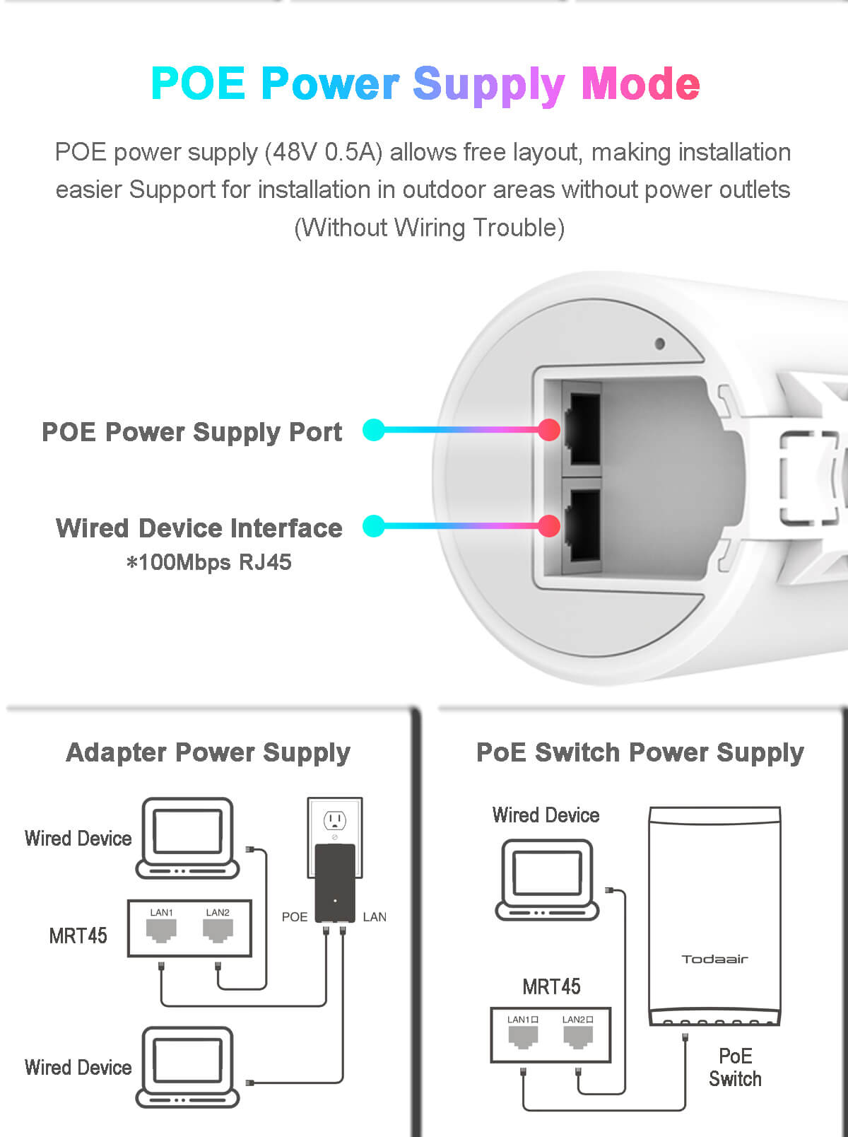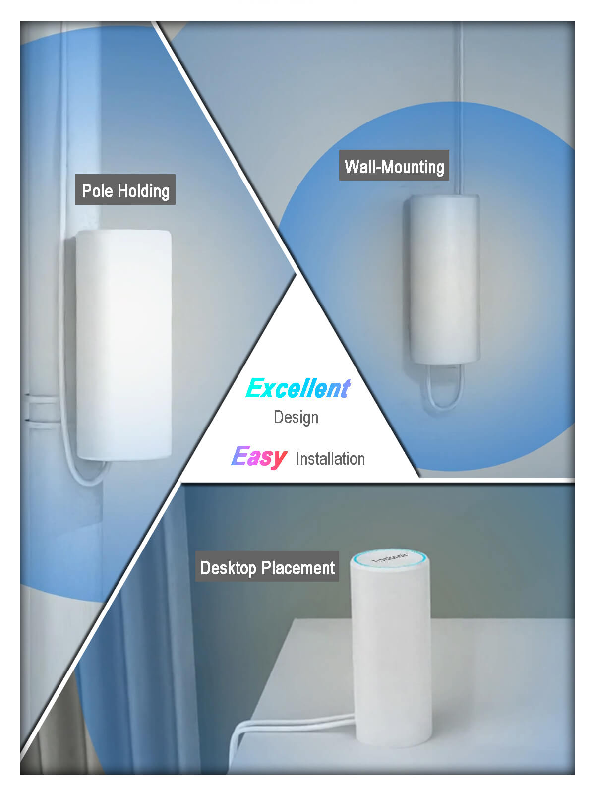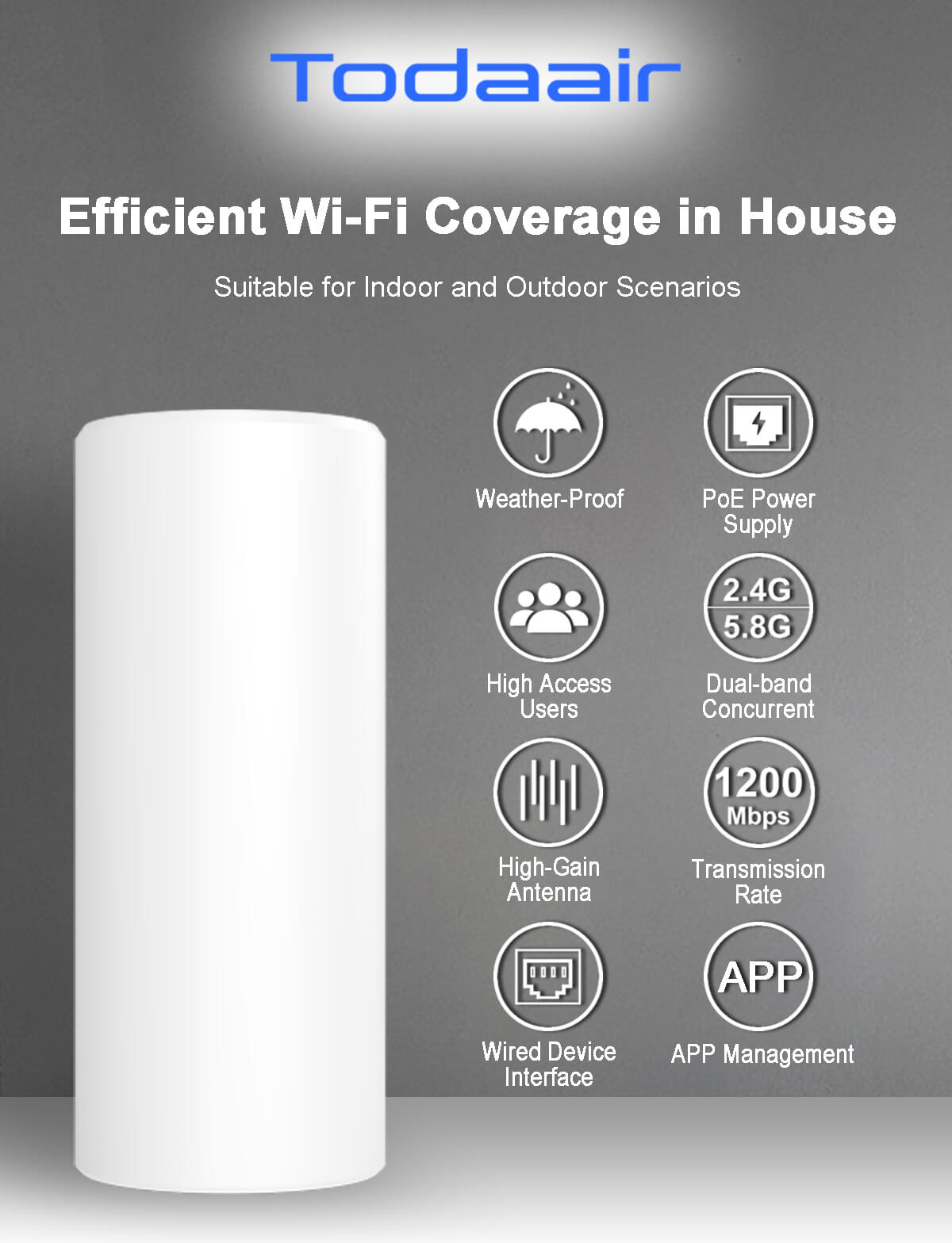 Thispproduct supports Wi-Fi 5, up to 1200Mbps commercial Wi-Fi coverage or home Wi-Fi coverage MESH router, and can support desktop placement, ceiling installation, outdoor wall waterproof installation, and pole installation.